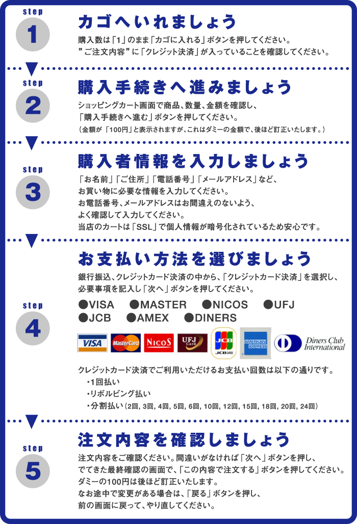 お支払方法をクレジット決済に変更する為の専用ページです。 購入数を1にして決済画面にお進みください。購入代金の100円は、後ほど訂正いたします。