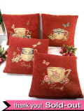 深い赤の布地に、4種類の可愛いカップとお花たちが描かれた4つのクッションです。