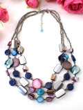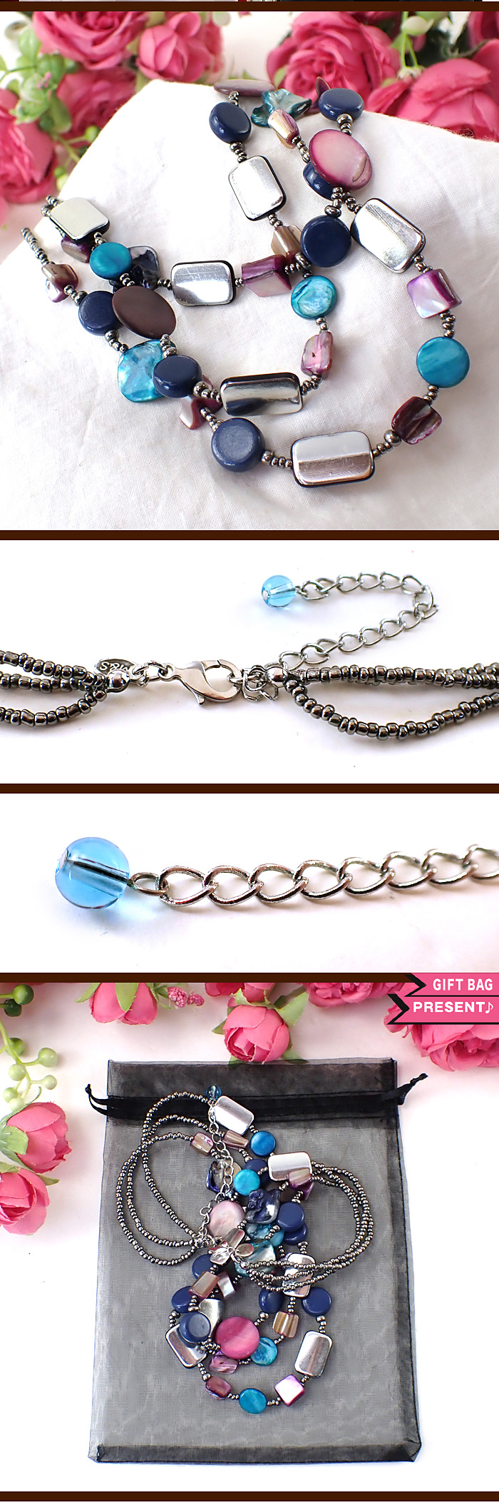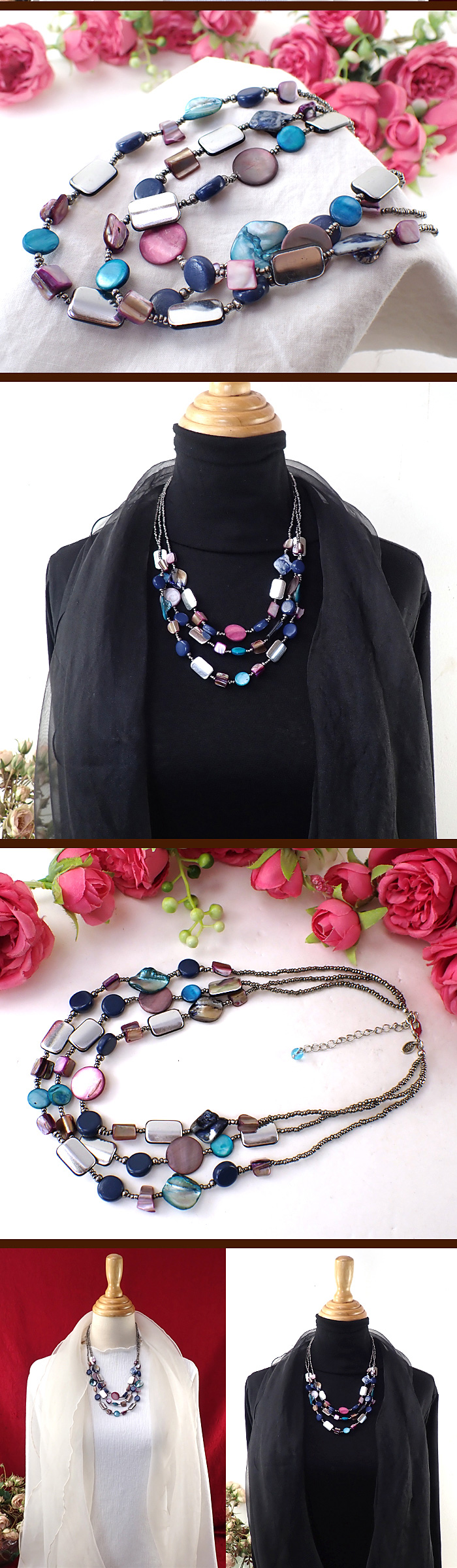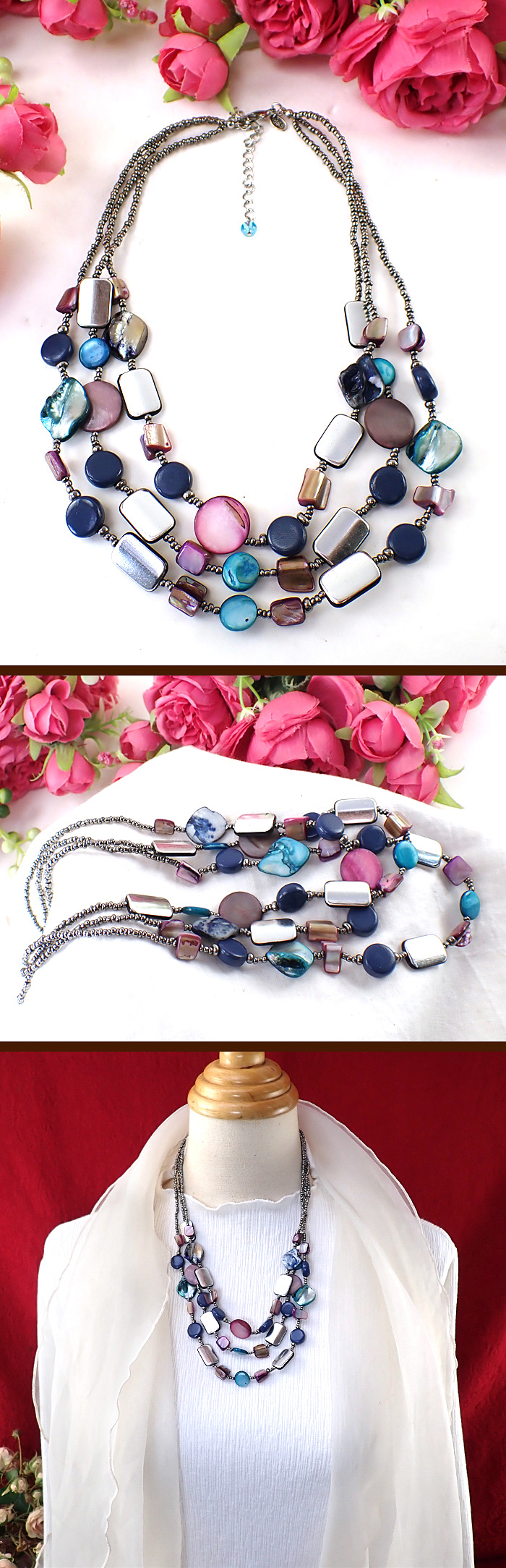 チェーン全体に天然貝とシルバーメタルが輝く3連のネックレスです♪