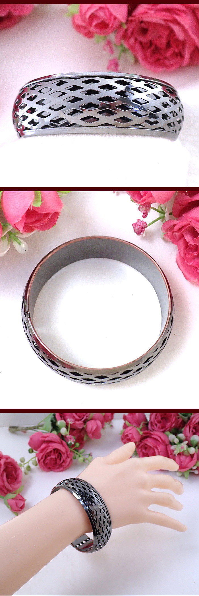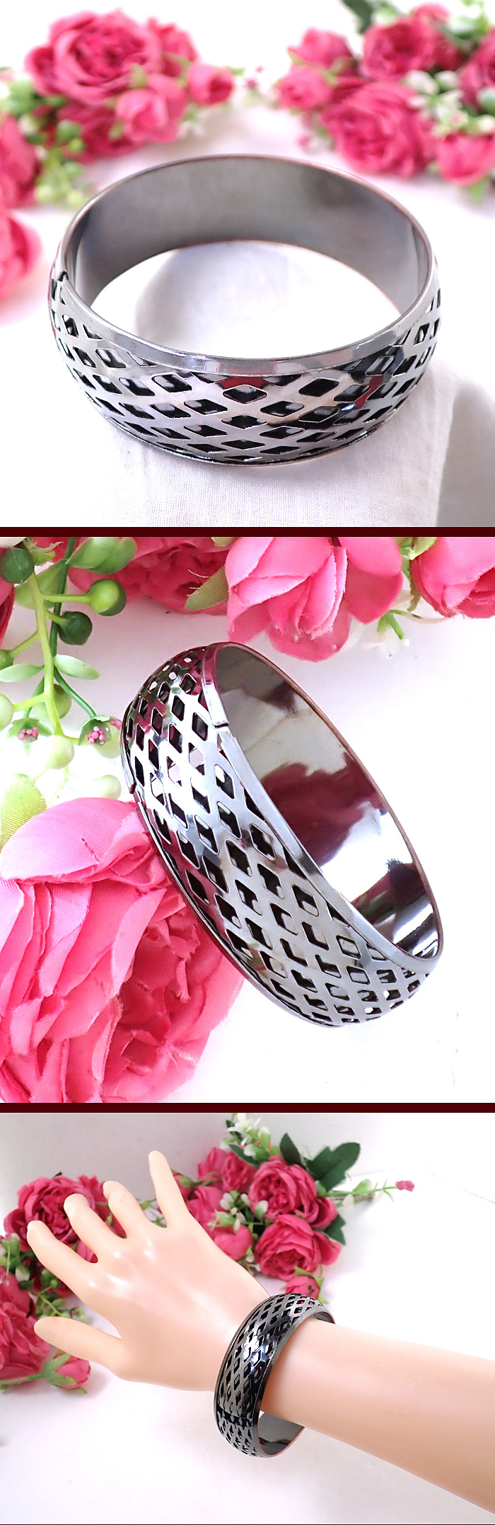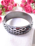 バングル全体にダイヤ形の透かし模様の銀細工がぐるりと表現されていて、