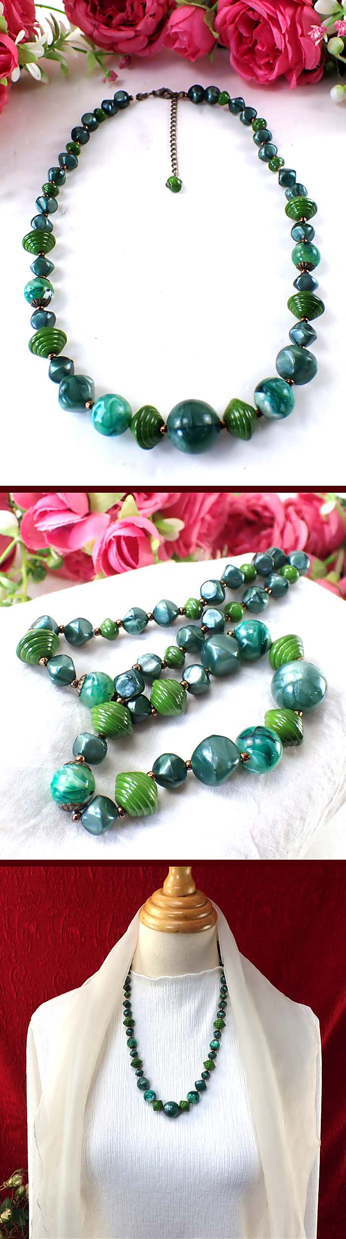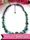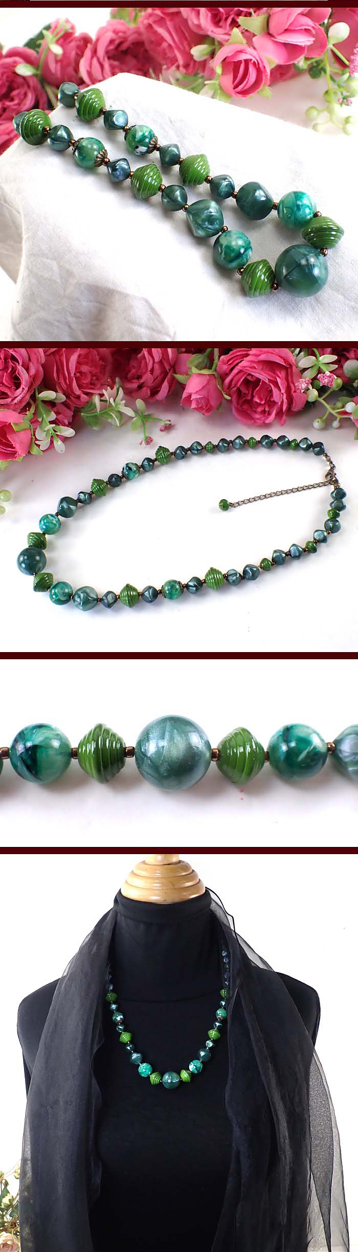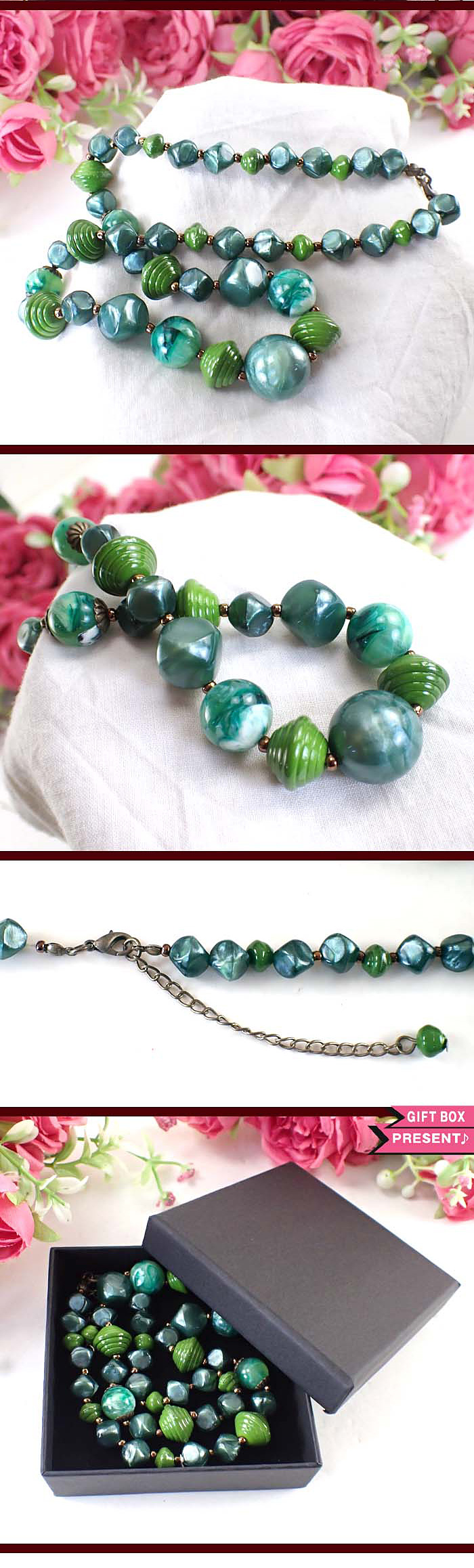 全長は58cmもあるロングネックレスで、緑の濃淡のレジンたちがきれいです♪