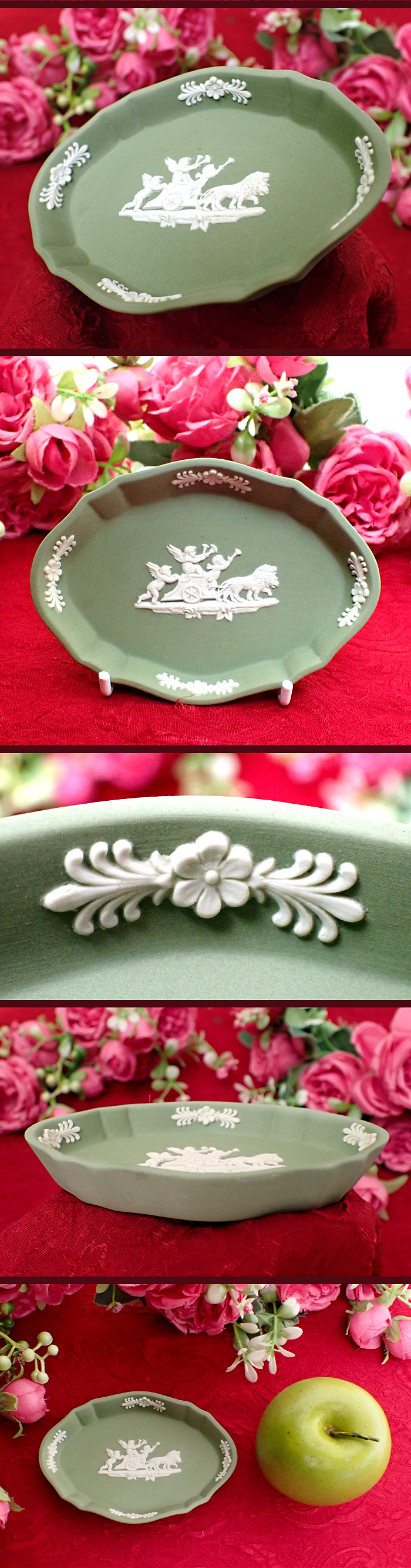 緑色のお皿のふちにはぐるりと、愛らしいお花のレリーフが表現されています。