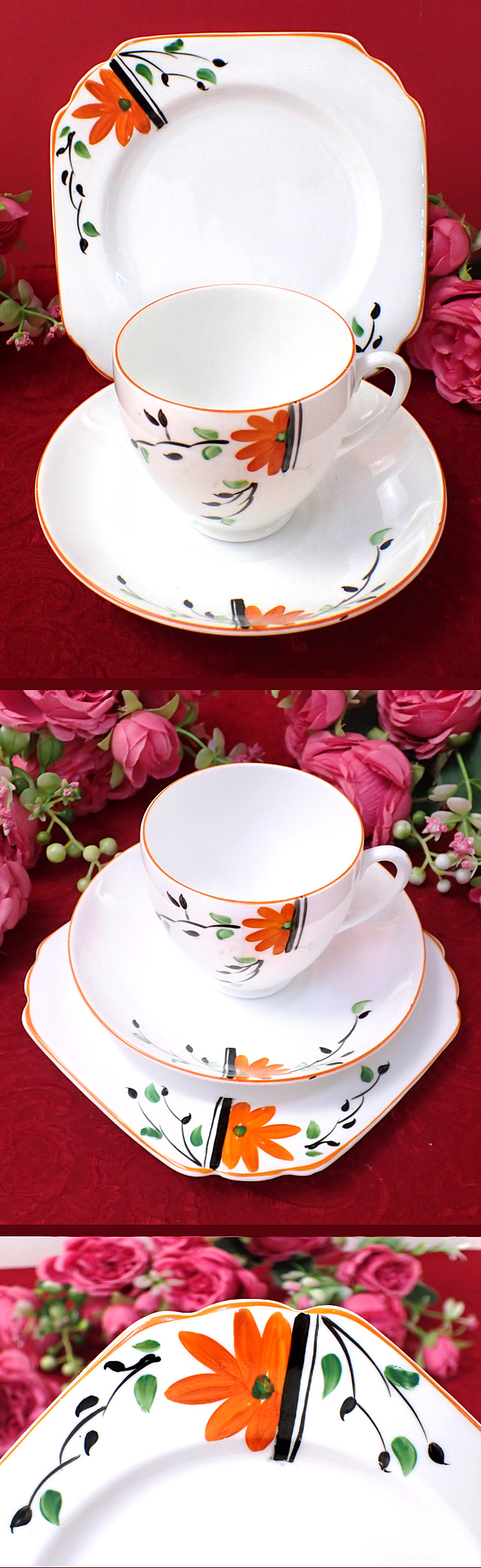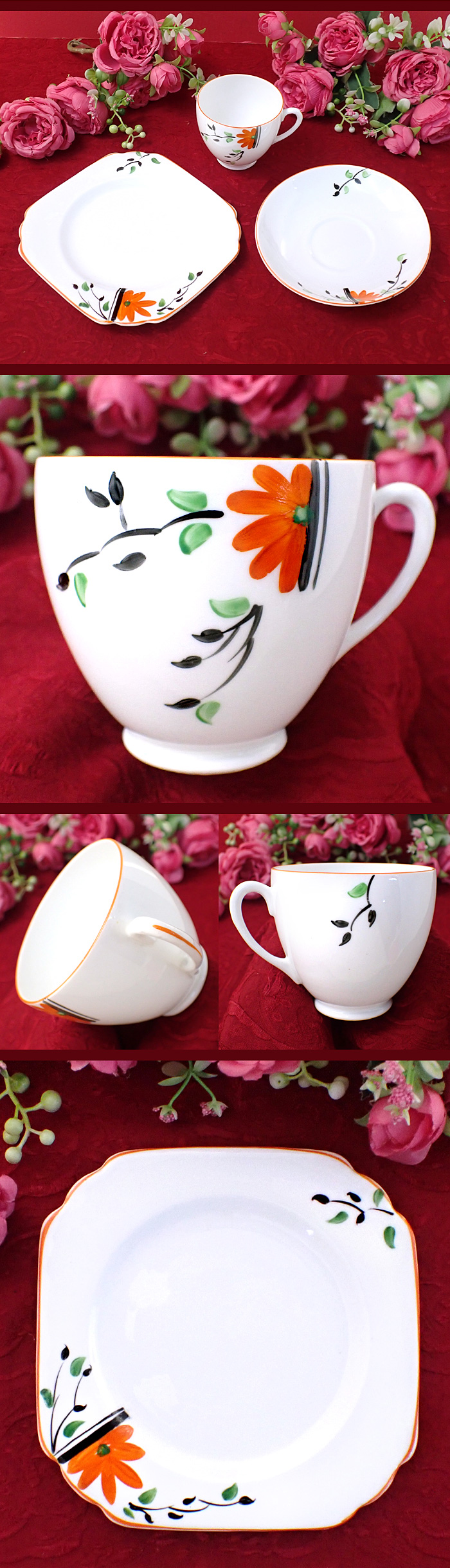 カップやお皿には、オレンジのお花と黒い葉たちがアートフルに描かれています♪