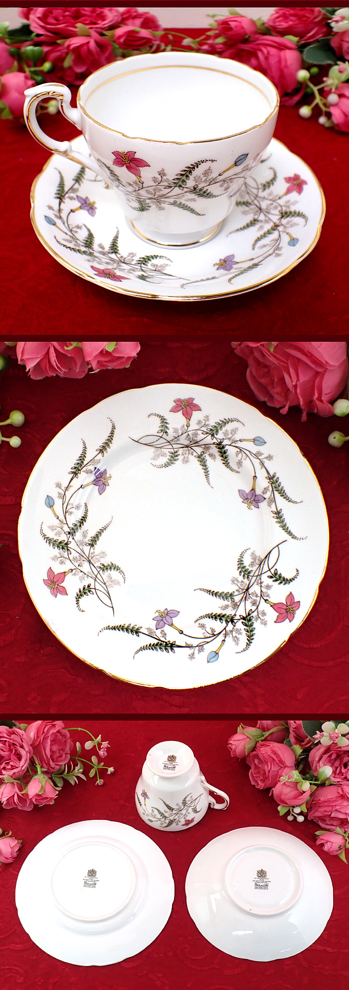 ボーンチャイナの白地の上にピンクと紫と水色の野の花たちが