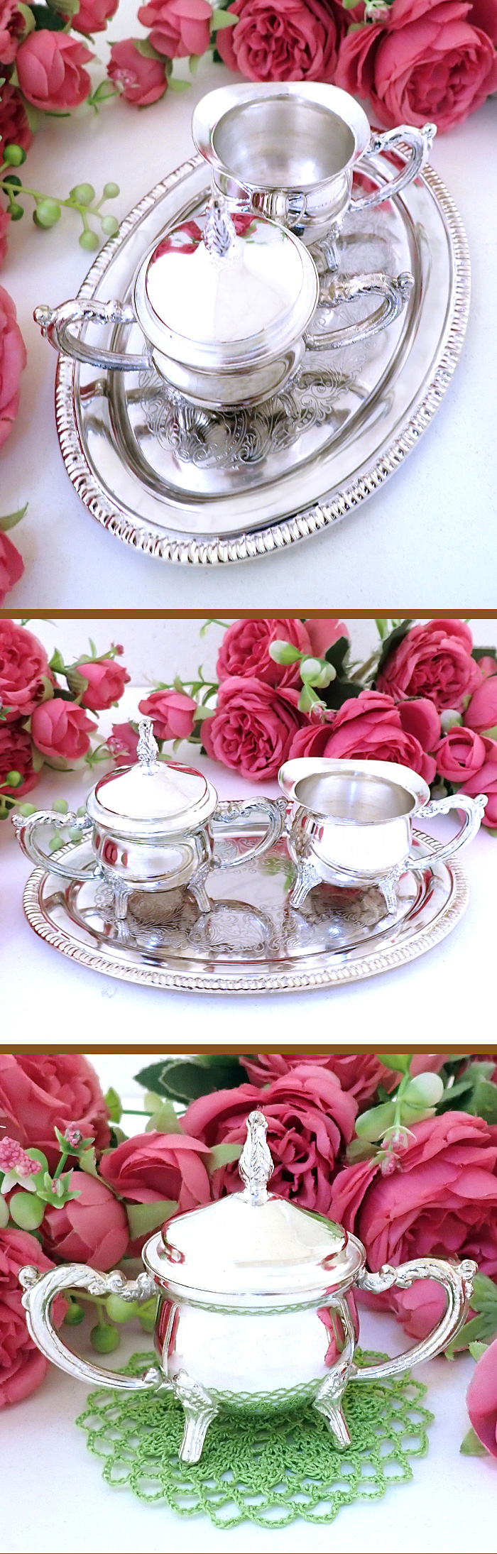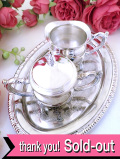 ミルクジャグとふた付きのシュガーボウルとトレイがついて