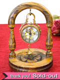 木製の台座とアーチ型の木枠から、スケルトンの球体の時計が掛けられています。
