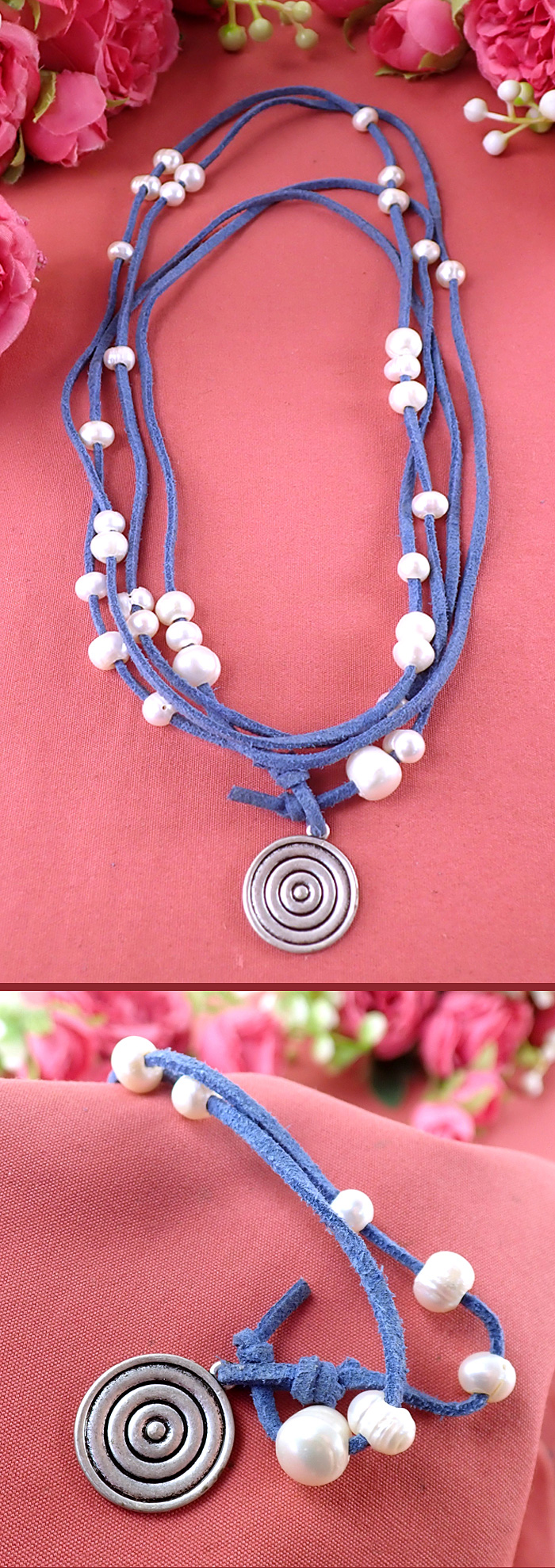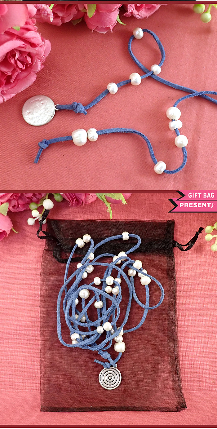 このネックレスは180cmもある1本の超ロングタイプで、水色の革の紐で作られています。